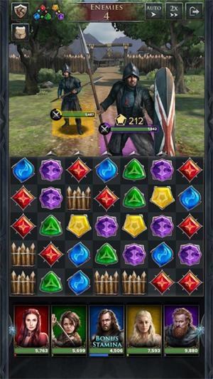 1.技能连锁爽快感:琼恩·雪诺的“长爪斩击”、丹妮莉丝的“龙焰吐息”等技能配合宝石连锁反应,战斗节奏感十足。