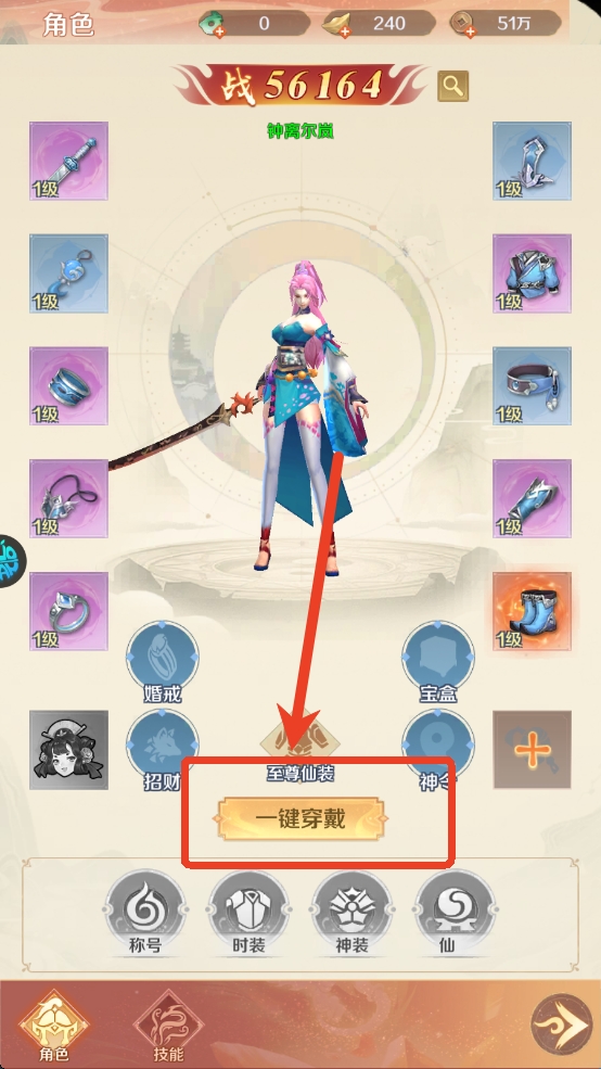 4、获得装备可前往角色界面穿戴,点击一键穿戴会自动使用比目前更好的装备。