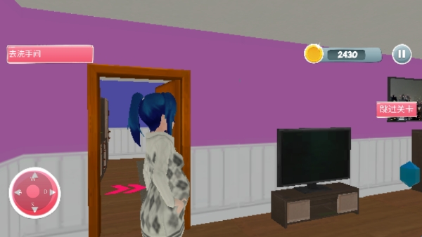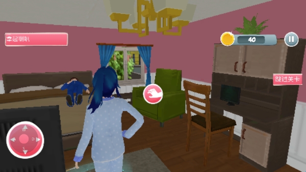 2、跟着游戏人物去走,首先拿起喇叭对女儿和丈夫叫醒服务。
