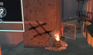 4、在马路对面可以看到燃烧的油桶,走过去后靠近油桶,用面包对着油桶跳一跳就可以点燃面包;