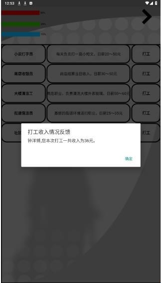 5.如下图,小编选择了小说打字员的兼职,完成之后赚取了36元。玩家需要合理打工才能够在游戏中逆袭!