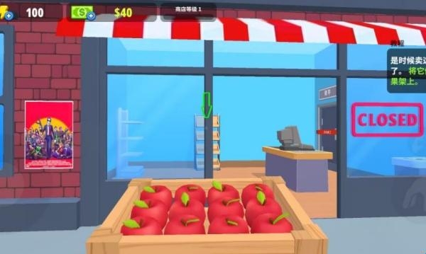 3、是时候卖一些物品了,将地上的苹果搬起来,放置到超市的货物架上面,解锁超市的项目。