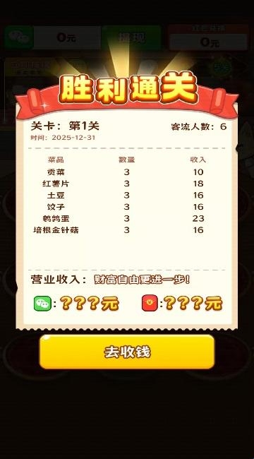 2、第一关顺利通过,完成6个订单,获取了红包奖励。