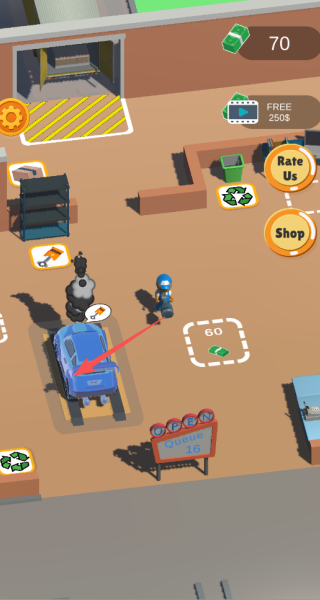 1、通过简单点击、拖拽操作清理车库垃圾、整理工具,快速完成场地初步改造,为修车业务做好准备。