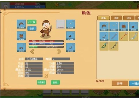 2、点击右上角的角色可以查看自己的属性、职业以及拥有的装备。