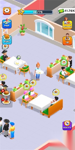 1、玩家进入游戏,从一家小餐厅开始,招聘热情的服务员和技艺精湛的厨师,开启经营之路。