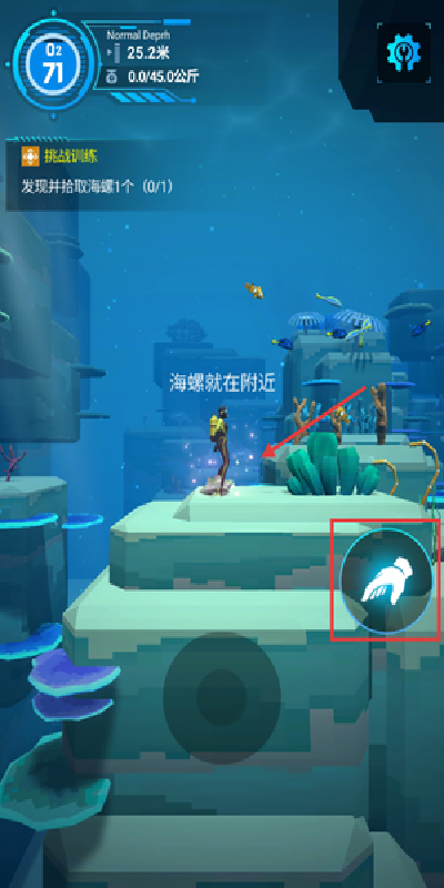 2、执行拾取海螺任务时,当系统提示“海螺就在附近”,点击屏幕上的手掌图标即可成功收集该物品完成目标。