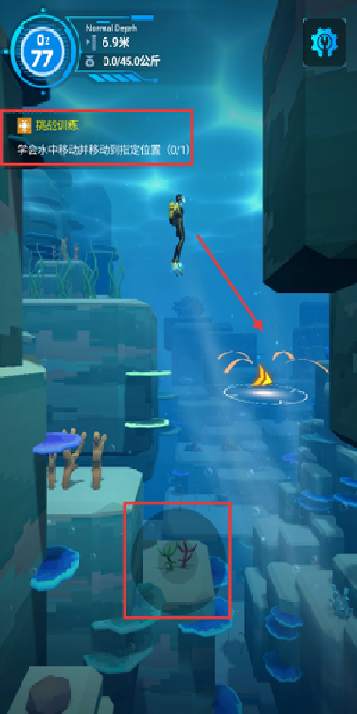 1、进入游戏后需关注左上角任务提示,操控潜水员向标记位置移动,逐步熟悉水下移动与转向的操作方式。