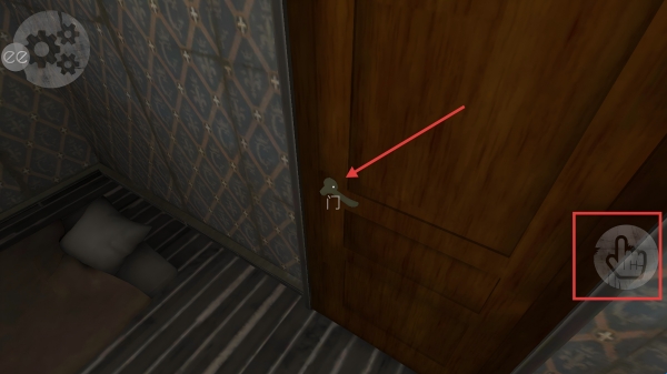 1、在房间里,看到木门把手,点击右侧手掌按键,尝试打开门,探索新区域。