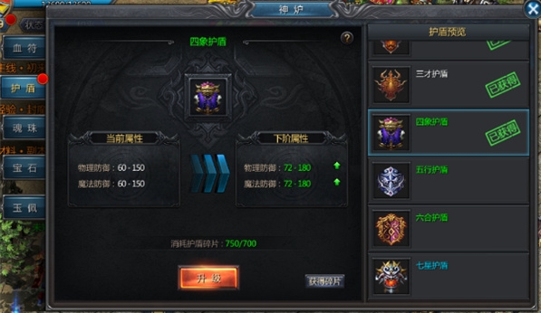 3、护盾不可以进行强化。点击主界面的神炉系统图标,进入护盾界面:护盾分为10级,等级越高的护盾能够提供给角色更高的物理和魔法防御加成。低等级的护盾可通过消耗护盾碎片进行升级,进阶为更高等级的护盾。拥有高等级护盾,再也不担心被别人一刀秒杀了。
