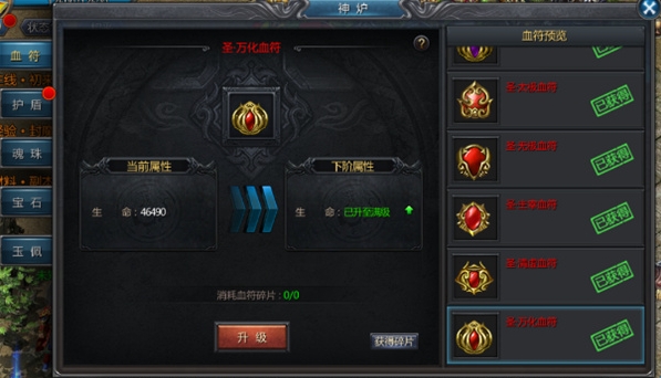 点击主界面的神炉系统,进入血符界面。血符分为15级,等级越高的血符能够提供给角色更高的生命值加成,让你在打头目当中不在为血少而烦恼。低等级血符可以通过消耗血符碎片进行升级,成为更高一级的血符,带来更多的生命值加成。拥有高等级血符之后,一向脆皮的法师也能站。头目啦!