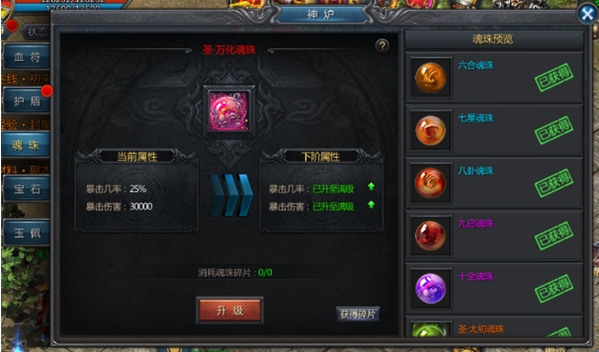 3、魂珠不可以进行强化。点击主界面的神炉系统图标,进入魂珠界面:魂珠分为15个等级,越高等级的魂珠能够提供给佩戴者更高的暴击率与暴击力提升。低等级的魂珠可以消耗一定数目的魂珠碎片进行升级,提升为高一级的魂珠。