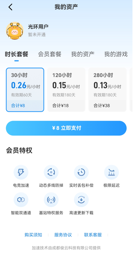 1、在【我的光环】页面点击【网络加速】可以购买光环加速会员,拥有电竞加速、动态多线防掉、实时丢包补偿等特权。