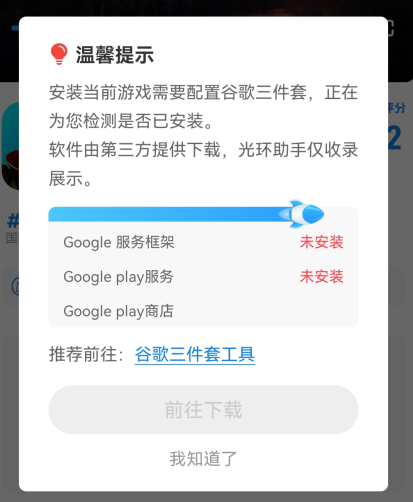 4、点击加速之后,国际服可能需要下载谷歌三件套才能正常启动。