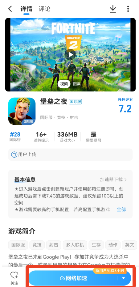 2、新用户可以免费试用三小时,在光环助手App内下载游戏,如果可以加速,下载完之后会显示【网络加速】。例如下图的堡垒之夜游戏。