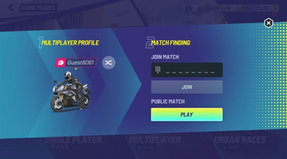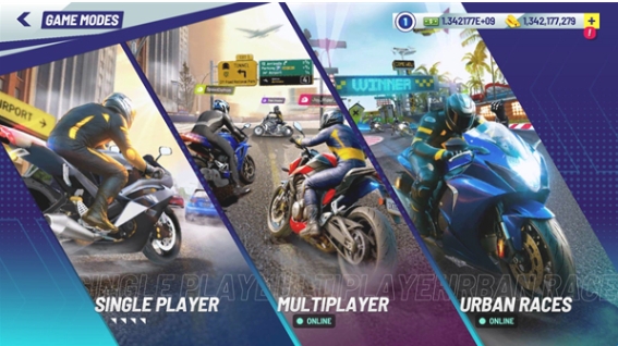 2、点击后玩家可以选择不同的游戏模式,第一个是单人,第二个是多人,第三个是城市竞速,后面两个都是需要联机的。