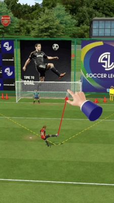 2、开始游戏,滑动足球,设计足球运动轨迹,进行射门、传球