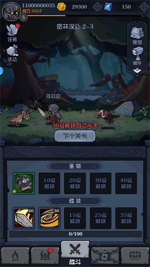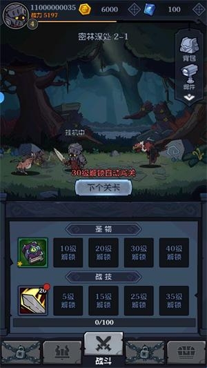 1、进入游戏后点击战斗页面的下一个关卡开始闯关,进入关卡后角色会自动攻击敌人。