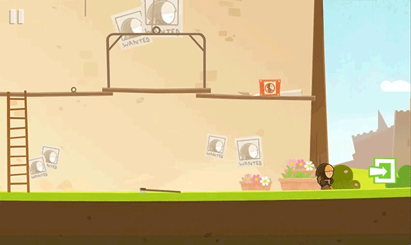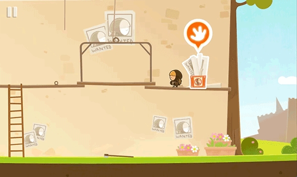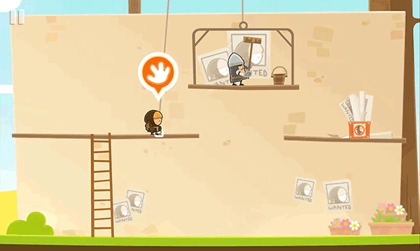 9、移动到图中位置,点击手掌,绳子松开,中间平台掉落。