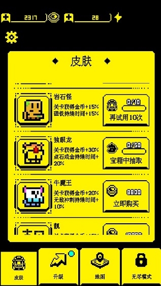 额外,玩家可通过累计的金币进行升级,升级方面有三种选项,分别是生财有道、至关重要和分秒必争;
