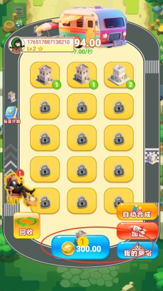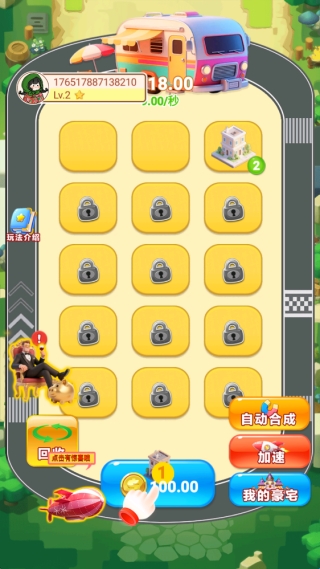 1.进入游戏后,通过点击并拖拽,将两个同等级房屋合成升级,并点击已建造的豪宅来收获金币。