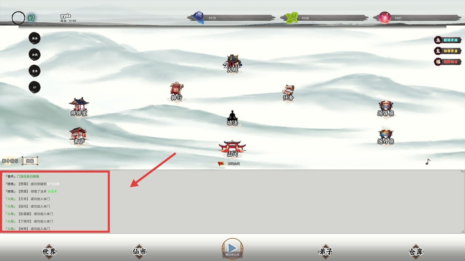 1、关注【任务指引】区域的【门派任务】【修炼突破】等任务,优先完成可快速提升门派等级与人物属性,解锁更多功能建筑。