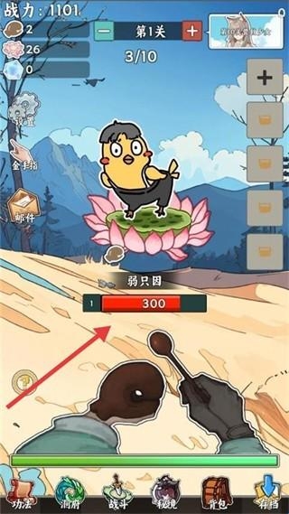 3、战斗界面中敲击木鱼对小怪【弱只因】造成伤害,积累足够伤害击败它来推进关卡进度。