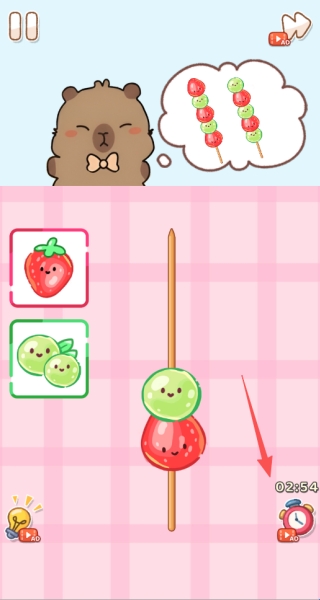3、点击左侧选中的草莓食材,将其拖拽到签子的对应位置,按照示意图的顺序完成糖葫芦的串制。