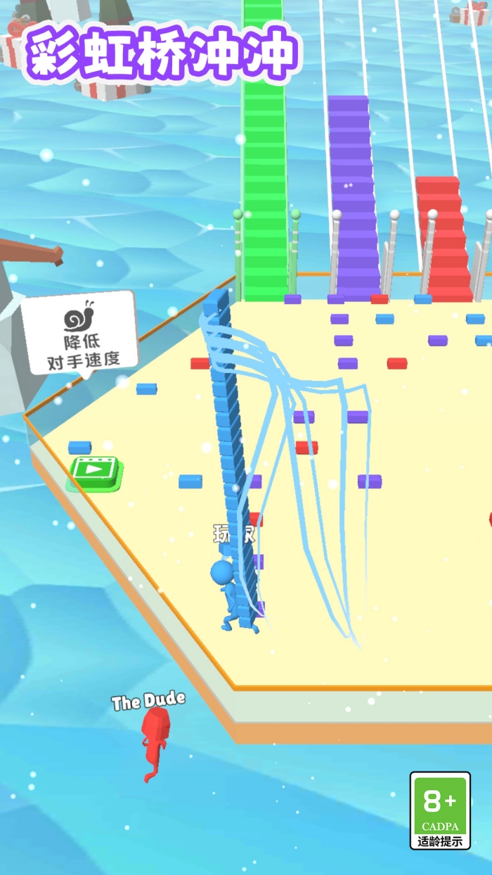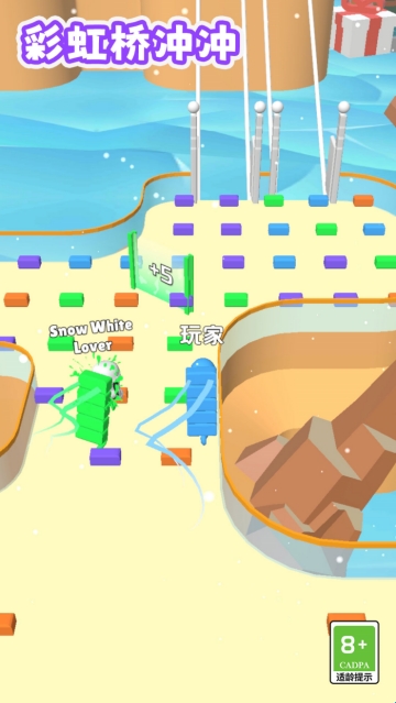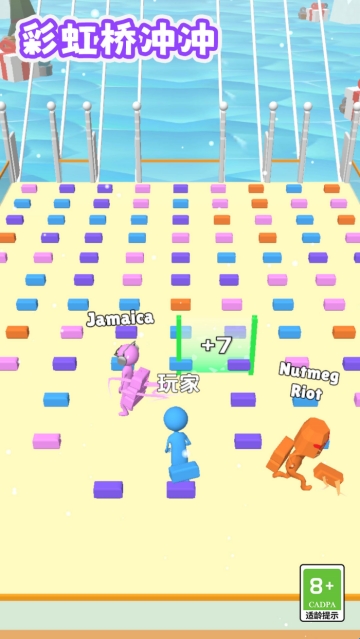 彩虹桥冲冲是一款以搭桥与竞速为核心玩法的趣味闯关游戏。游戏中,玩家需要在竞技场上与对手展开竞争,争夺散落在地图中的彩色方块。这些方块不仅是胜利的关键,更是你建造彩虹桥的材料。
