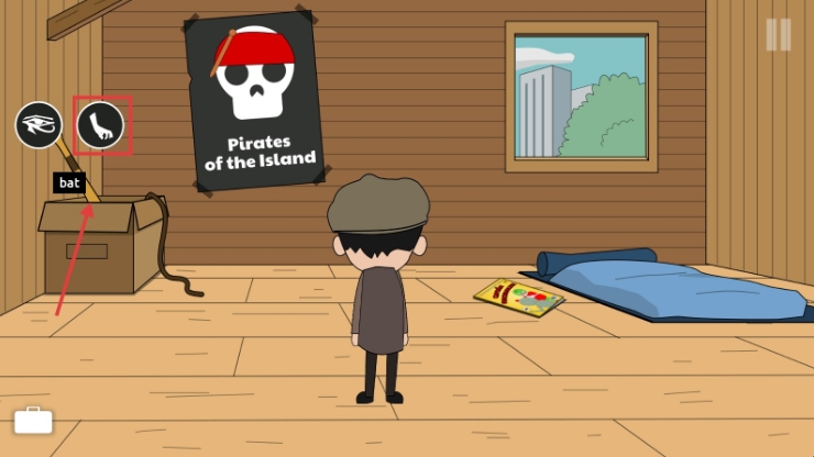 3、回到房间后,我们点击带有手形图标的按钮,去拿取箱子里的【bat】,为后续复仇做准备。