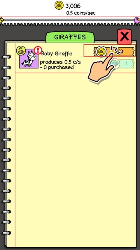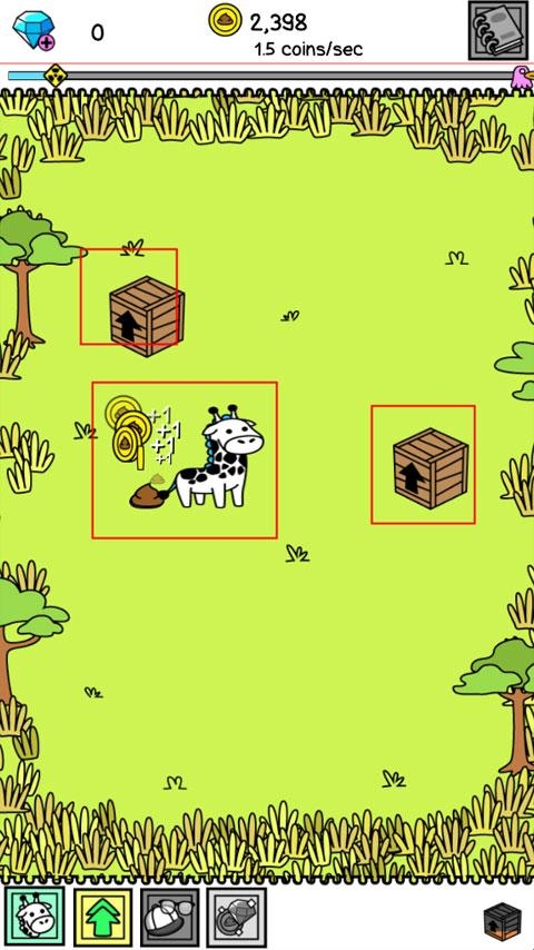 4、然后点击下方的双层树的图标购买箱子到屏幕上,箱子里面会有新的长颈鹿出现,并且多次点击长颈鹿可以快速拉出粪便,并获得更多金币。
