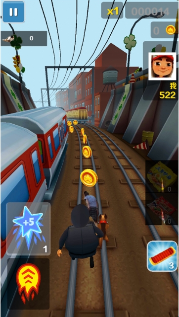 2、动感的背景音乐和快节奏的跑酷游戏,城市的风景在迅速后退,我们在疯狂地向前奔跑;