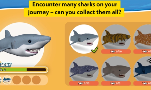 游戏中有22种不同的鲨鱼,玩家可以尝试发现并收集全部鲨鱼,包括史前鲨鱼。