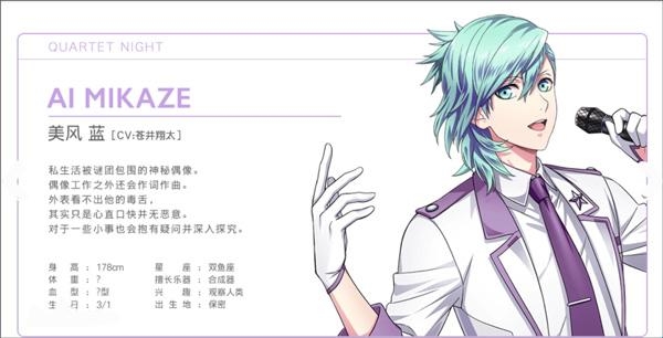 私生活被谜团包围的神秘偶像,偶像工作之外还会作词作曲。外表看不出他的毒舌,其实只是心直口快并无恶意,对于一些小事也抱有疑问并深入研究。