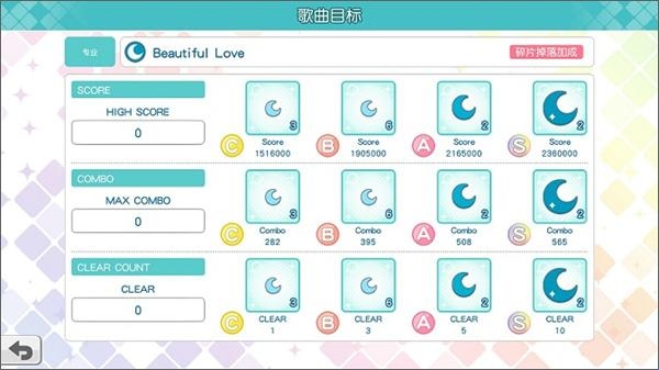 2、歌曲目标,在“通常歌曲”中,达成歌曲目标可以获得大量无偿水晶,水晶可用于恢复体力、购买摄影券(抽卡)、解锁回忆纪念板、增加生写上限等。