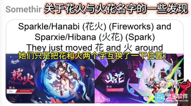 “火花”作为“花火”的SP形态,其命名方式延续了“大黑塔”等角色的换字传统。官方设定暗示其可能是一位虚拟。。,早在3.8版本上线的遗器“。。间的千窗万面”故事中,虚拟。。“花奈咪”的经历就已埋下伏笔,其角色外貌细节与火花高度吻合。