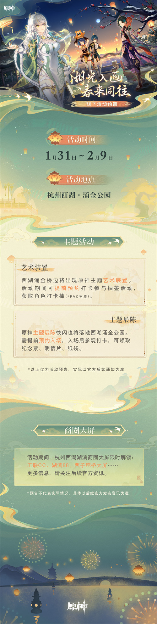 旅行者,原神×西湖联动预告来了~ 1月31日~2月9日,在西湖和璃月友人共度海灯节吧!详情请点击下方长图查看。