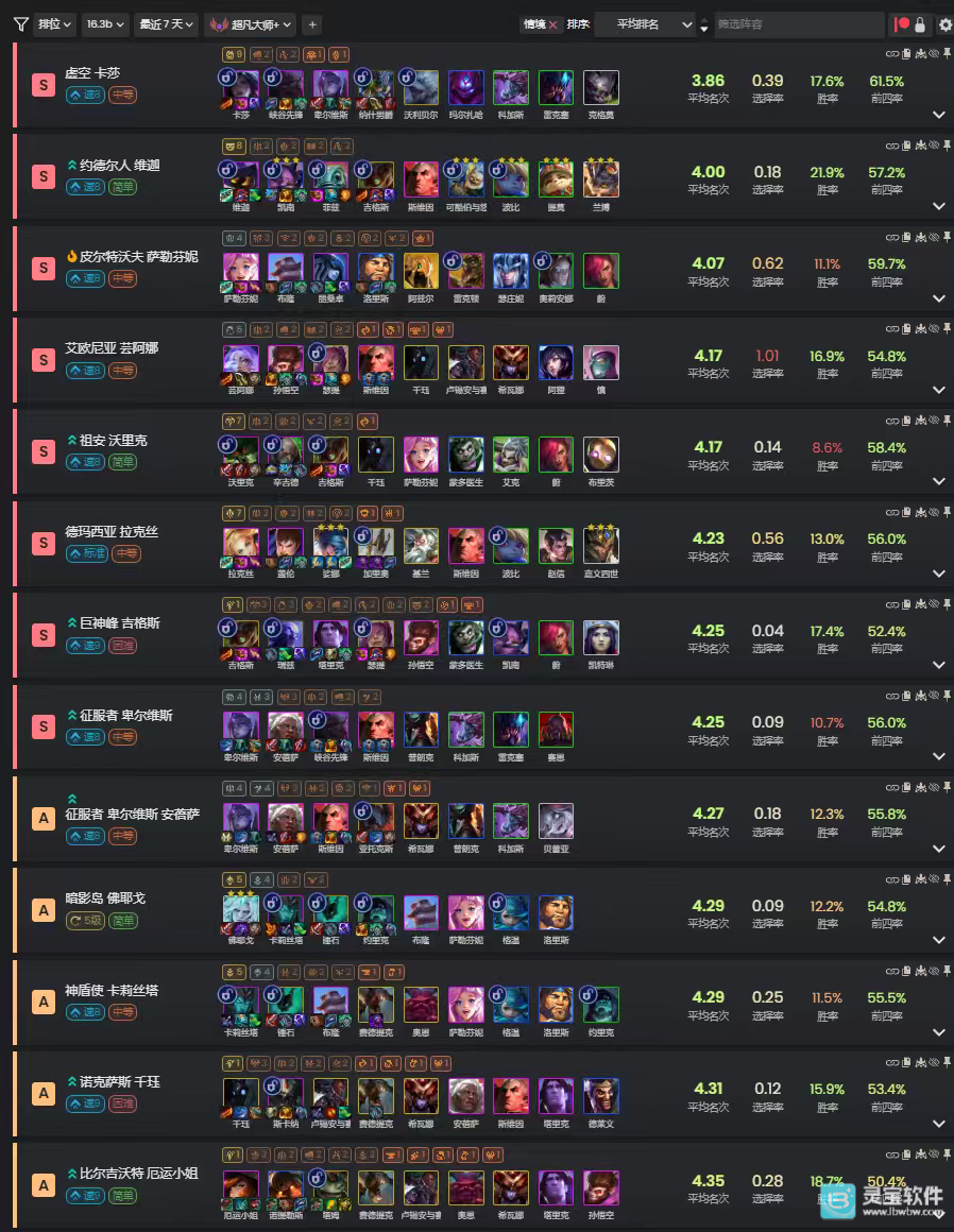 这是云顶热补丁后大数据网站metatft给排的梯度,大家可以参考一下,赌发条别碰,龙王很胡再玩。上分暂时推荐:根据前期来牌无脑玩艾欧/虚空/德玛!
